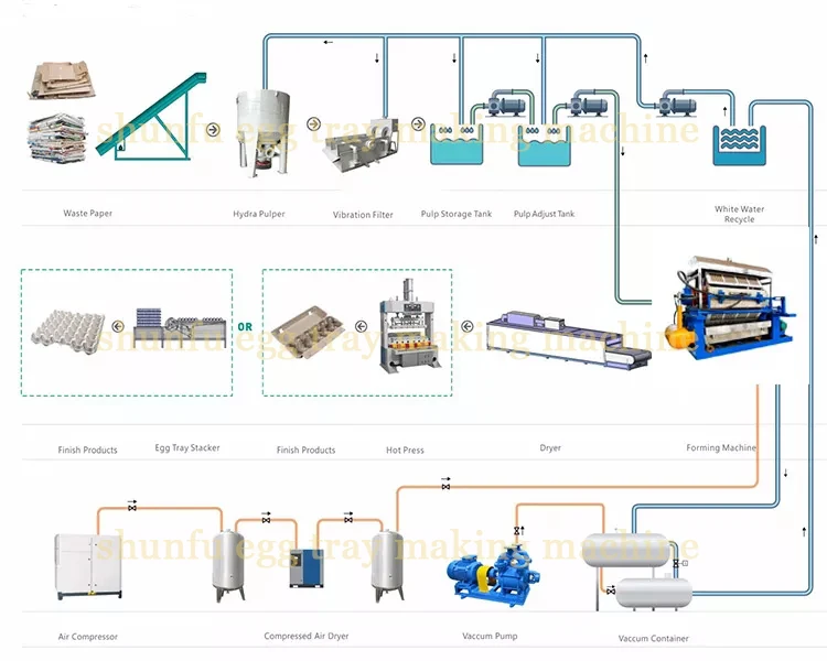 The automatic egg tray production line is composed of pulping system, forming system, drying system, stacking system, vacuum system, high pressure water system and air pressure system.Using waste newspapers, waste carton paper, office paper, scraps and other waste paper as raw materials, through hydraulic disintegration, filtration, water injection and other processes to prepare a certain concentration of slurry, through the molding system on the special metal mold through vacuum adsorption A wet blank is formed, which is then dried on a drying line, and then stacked after being hot-pressed on-line.